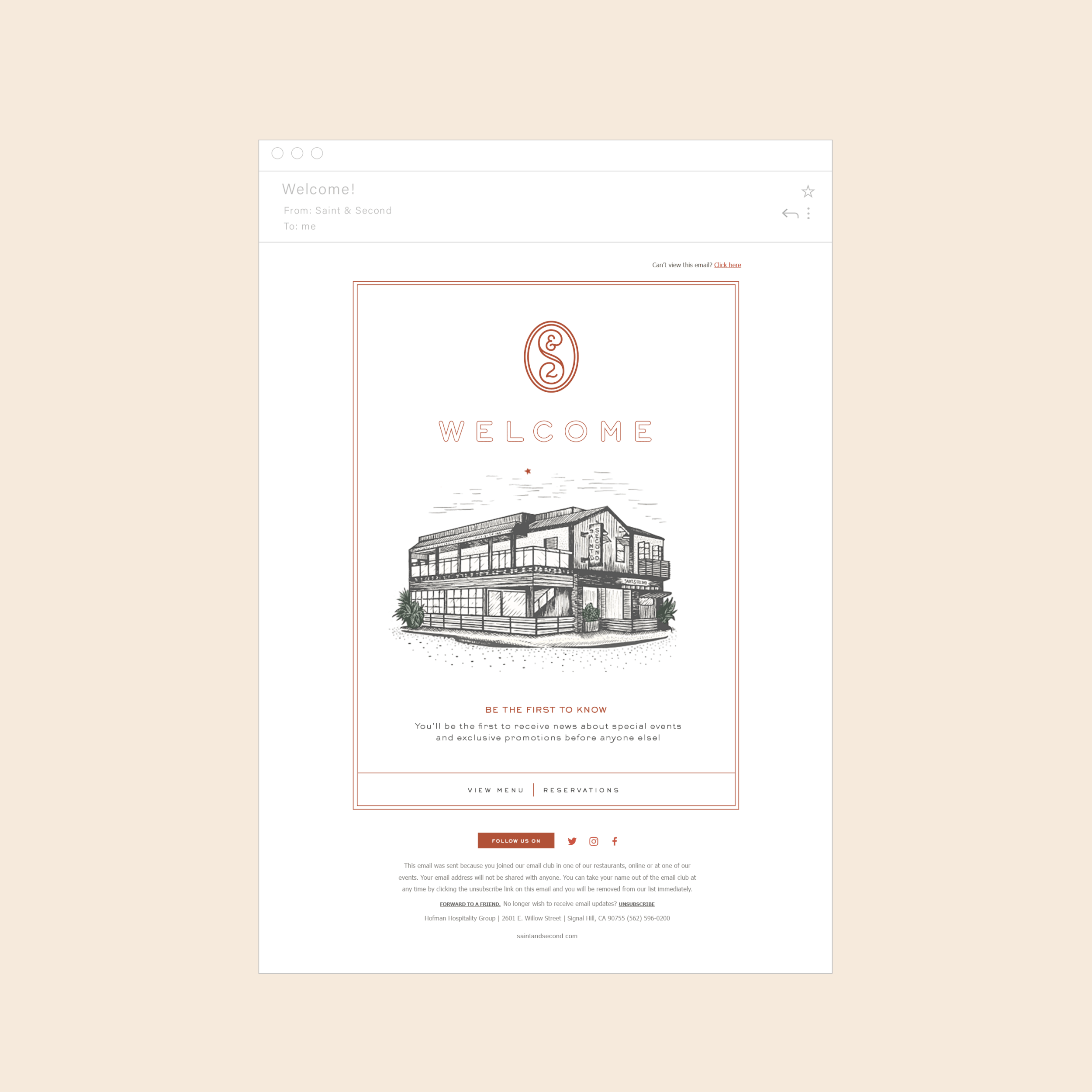 When designing their welcome eblast, I decided to go for a clean and modern look and to feature a hand-drawn illustration of the restaurant’s exterior animated with blinking stars to evoke a sense of romance and wonder.